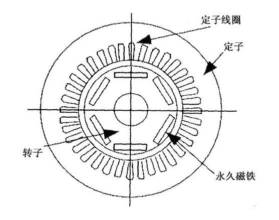 永磁同步电动机与普通异步电动机的不同是转子结构,转子上安装有永磁体磁极,永磁体磁极安装在转子铁芯圆周表面上,称为凸装式永磁转子。